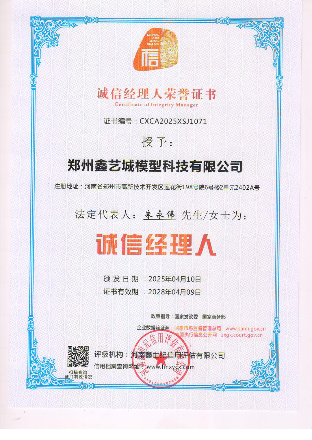 诚信经理人荣誉证书